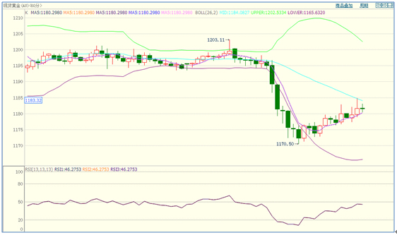 隔夜美盘时段,黄金突然跳水,短时间暴跌超过20美金,跌破前期50%黄金分割位支撑1184美元,最低触及61.8%回调位1172美元一线,行情再度转为空头,1184美元由强支撑转为强压力,操作建议逢高做空。