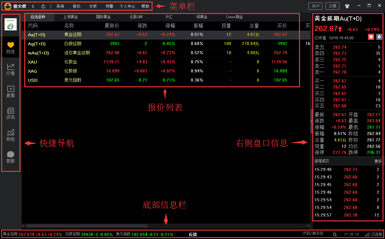默认情况下,这是客户登录软件后的起始页,包含菜单栏、快捷导航、报价列表、右侧盘口信息、底部信息栏。