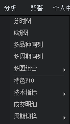 3)分析下有分时图、K线图、多品种同列、多周期同列、多图组合、特色F10、技术指标、成交明细、周期切换。