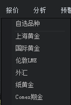 2)报价下有:自选品种、上海黄金、国际黄金、伦敦LME、外汇、纸黄金、Comex期金。