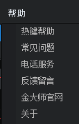 帮助下有:热键帮助、常见问题、电话服务、反馈留言、金大师官网、关于。